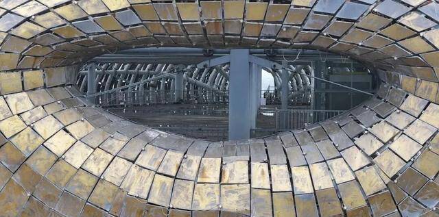 它高达62米,身长90米,横卧在岛上的样子,仿佛一条刚从江中跃起的巨鱼,阳光下,8920块铜板片拼接而成的鱼鳞熠熠发光,远看像一条“大金鱼”,又像一件精雕细琢的黄铜铠甲。