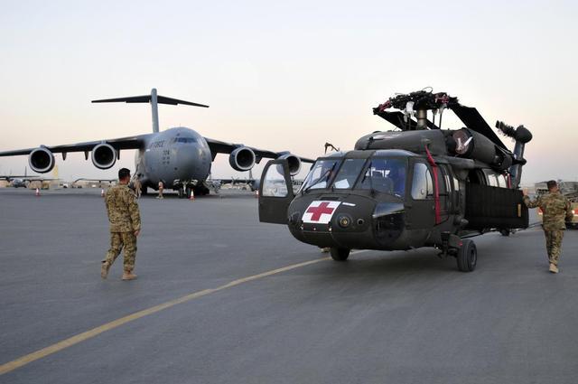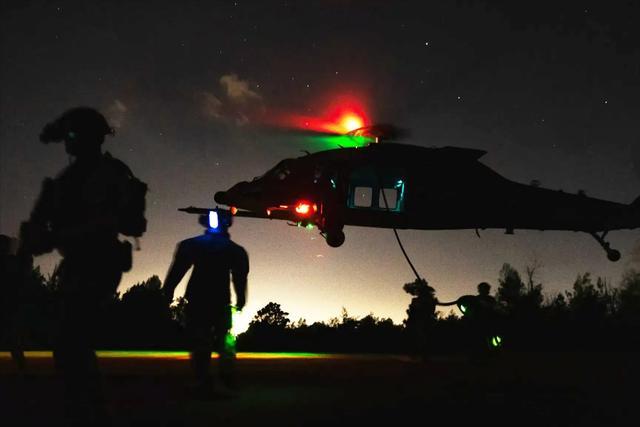 流程非常清晰:C-130负责把人和装备运到简易跑道,卸下小鸟直升机;小鸟分两种,一种带武器提供火力掩护,另一种负责接人;此外,还有大量人员负责基地警戒、通讯、医疗和后勤保障。